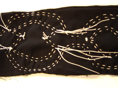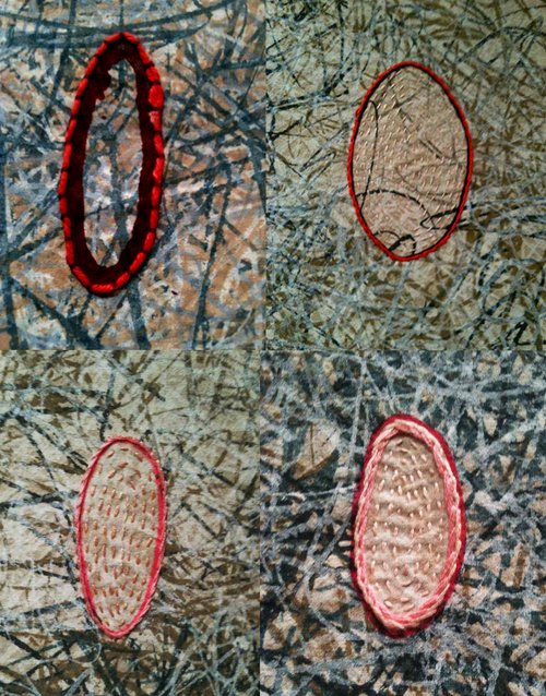 Small ovals hold your attention as place markers for contemplation-meditation. The slightly raised embroidered thread has associations of scar, tattoo, branding or stigmata.