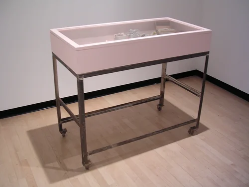 The use of the boxes as containers symbolizes the idea of transport to the after life. The box as open casket. Their vertical positioning on the wall references the human body with the intention of confronting death and the afterlife. The sticks were gathered from the beach and rescued into this work thereby redeeming their status as dead wood. Each group of sticks was wrapped with strips of dyed cloth, paper, ribbon and string. Each had embedded between the layers small objects or amulets such as buttons, letters, and linen handkerchiefs. These wrapped sticks took on the uncanny appearances of misaligned bodies of hands and feet.