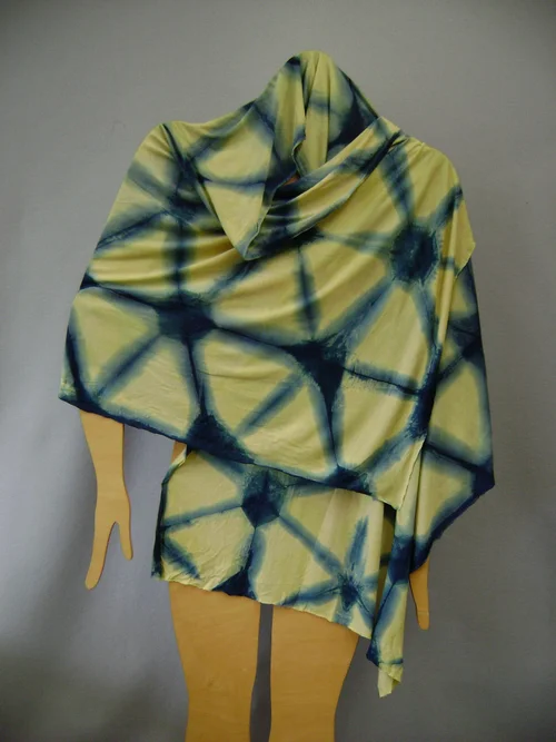 I love creating patterns on cloth with Shibori. Shibori is a controlled resist dye method developed in Japan. Several types of dye classes are utilized corresponding to the type of fiber content in each cloth. Indigo is a natural blue vat dye and various depths of blue can be achieved depending on the strength of the vat and the number of dips into the vat. Acid dyes work on the protein fibers of wool and silk and also nylon.