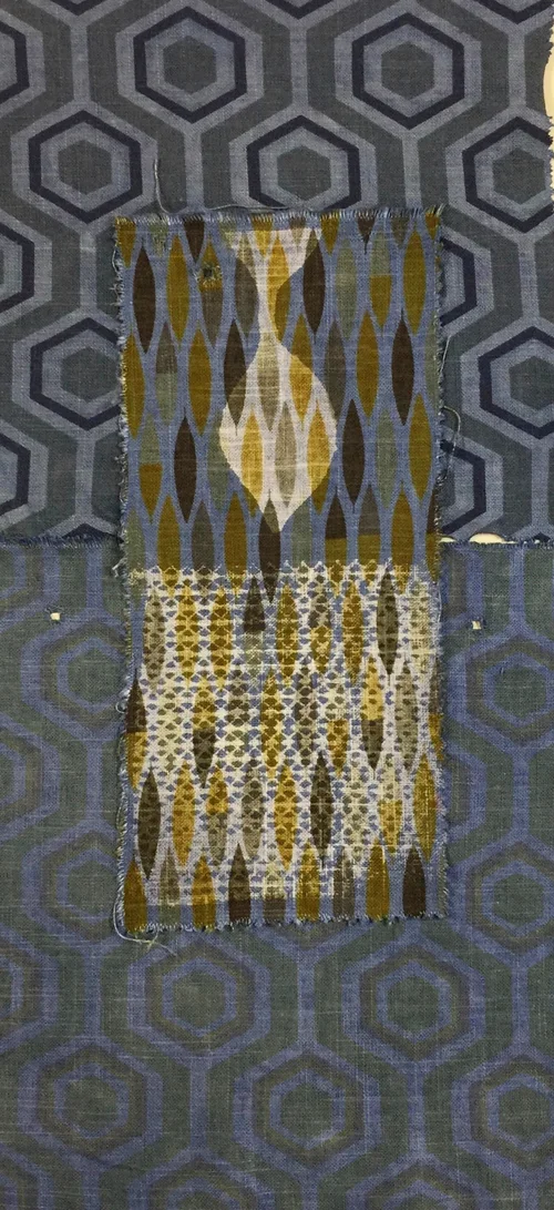 The processes of over-dyeing in both Re Bloom and Hexagon Blues brought unity to the fabrics. Pink was chosen for Re Bloom because it signifies growth and femininity. Surface depth is created by the layers of screen-printing and stencils with pigments and discharge paste.