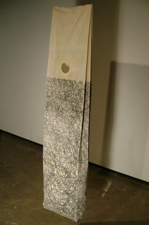 An understanding of the work comes through your senses. Form is given to abstracted figures or surrogates in the guise of empty vessels. The visual fragility of the cloth in my work contributes to associations of membrane, veneer and permeable skin, sometimes bruised and vulnerable, sometimes misshapen and marked upon. Like skin, cloth holds the wear and tear of time through stretching, abrasion, and sagging. I see my work as abstracted figures, whether as flat planes or as sculpture. They are constructed as emotional surrogates; empty vessels, thin skinned, splayed out, hung up, tattooed.