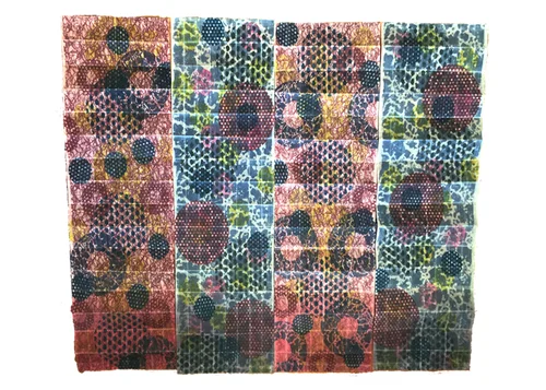 Constructed Harmony is a total of 4 dyed and printed cloth panels, waxed, embroidered, folded horizontally